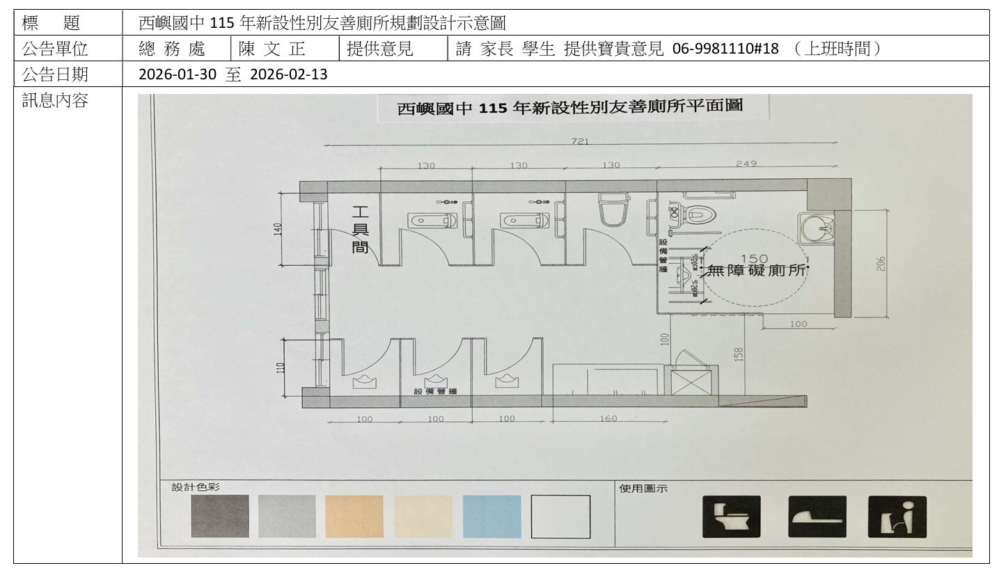 學校正在規劃設置一間性別友善廁所,希望利用難得的預算整修一間注重性別平等,尊重性別差異的友善廁所,同時兼顧安全、安心、隱私、舒適的使用原則。目前設計廁所內部有3間小便斗、2間蹲式便器、1間坐式馬桶,規劃期間請能賜予寶貴意見,讓廁所設計更加完善。若網頁頁面的圖看不清楚,請下載附件圖檔觀看。